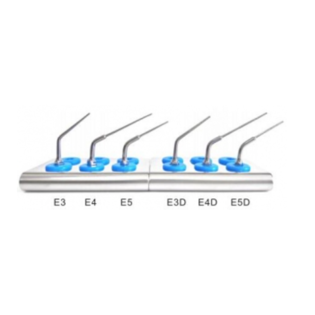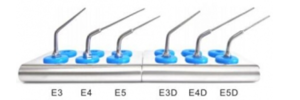 - E-5: Насадка имеет короткий и тонкий кончик. Длина рабочей части насадки малого диаметра составляет 16 мм. Легко проникает в труднодоступные места и удаляет зубной камень. Используется для извлечения пломбировочного материала и инструментов из верхней трети корневого канала, разработки и ирригации 1/3 корневого канала, а также для удаления помех при пломбировании корневого канала при повторной обработке.