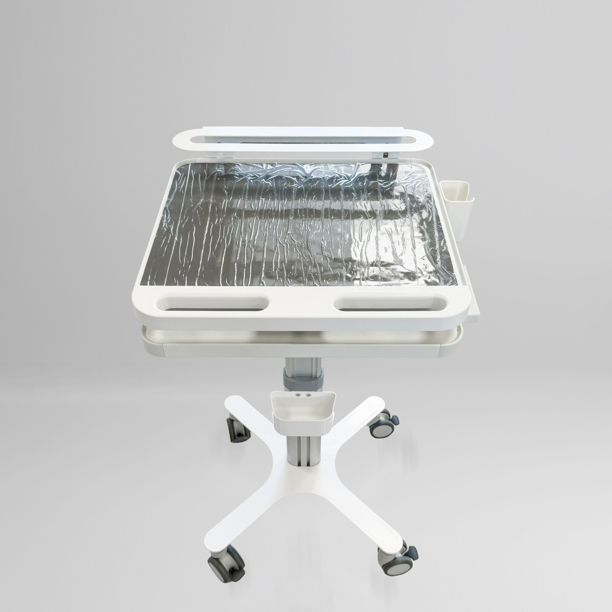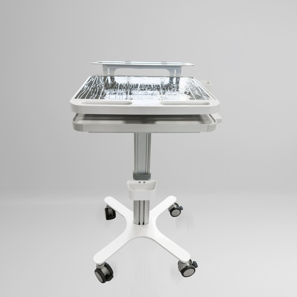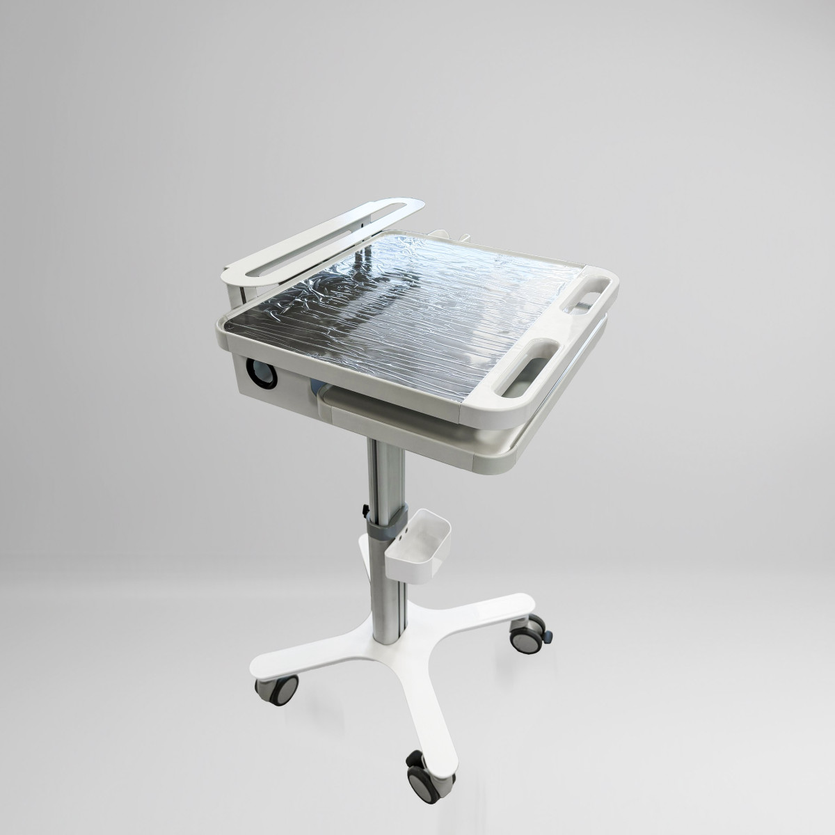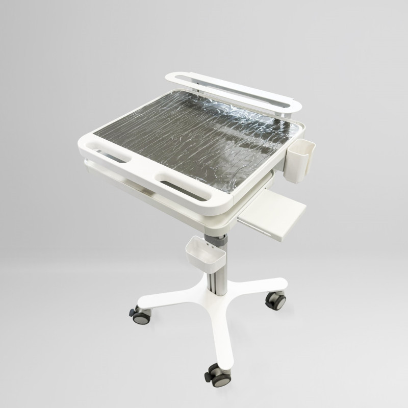 • Адаптивная высота (600–900 мм): Пневматическая регулировка позволяет мгновенно настроить столик под рост врача или высоту кресла пациента.