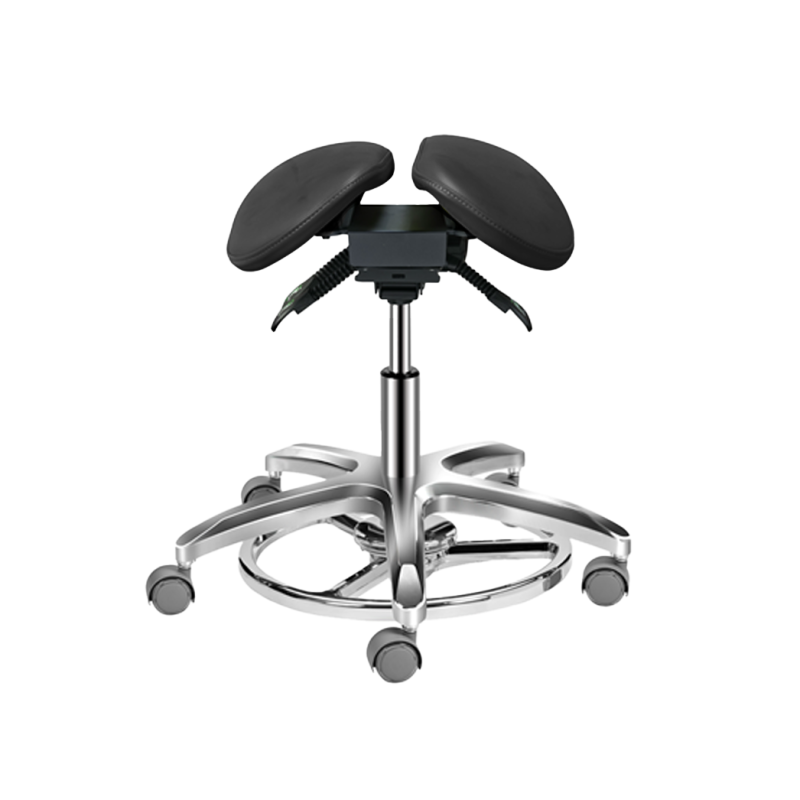 Сидение стула состоит из 2 половинок. Благодаря чему нагрузка равномерно распределяется на кости таза, снимая нагрузку с ног.
